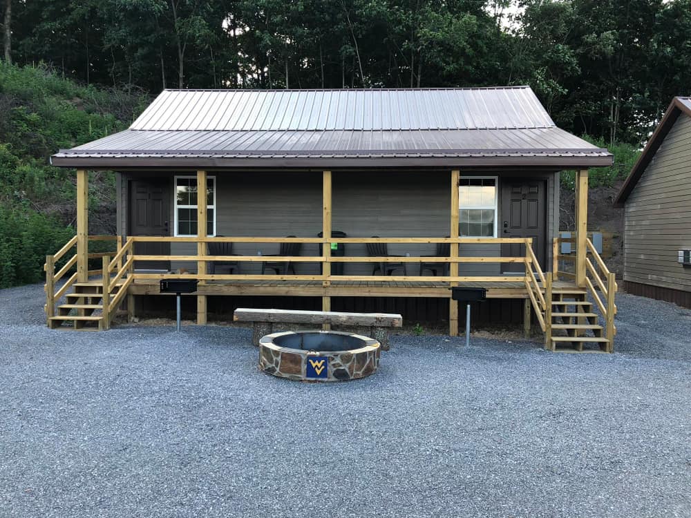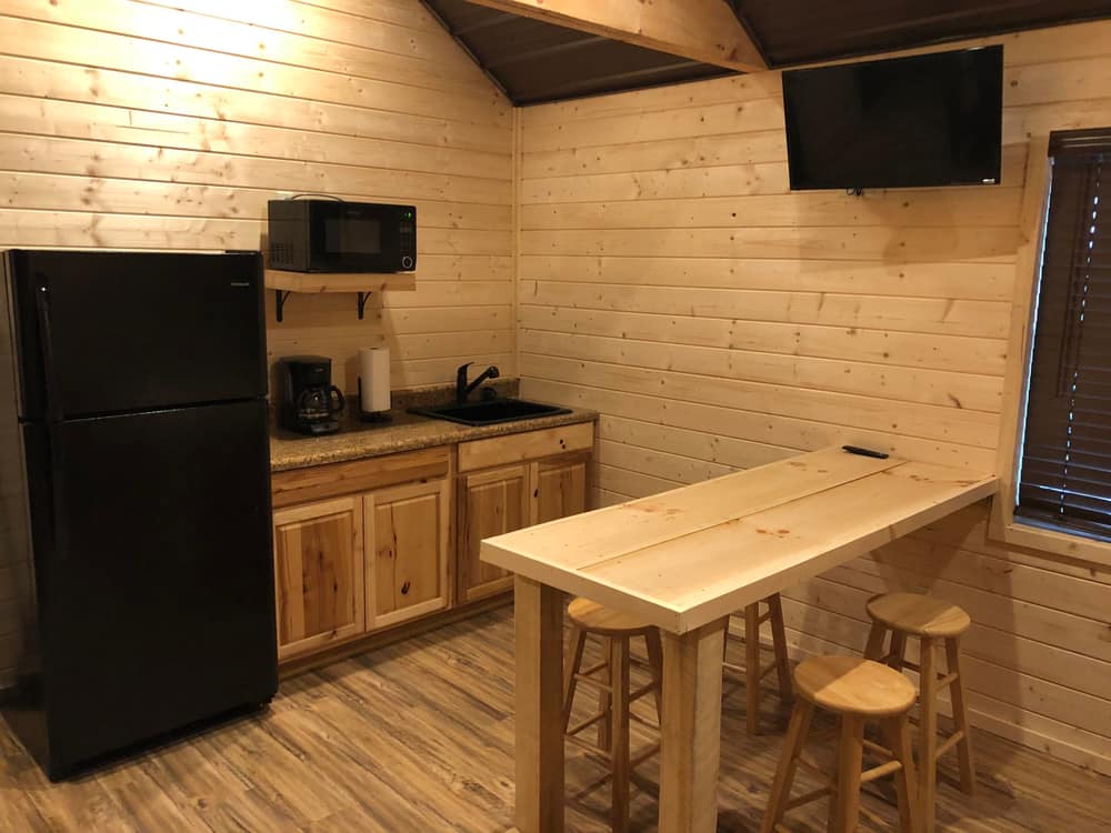 Includes heat/AC, Wi-Fi, 32″ TV, coffee pot, microwave, and full-size refrigerator, plus a designated charcoal grill and shared fire pit.